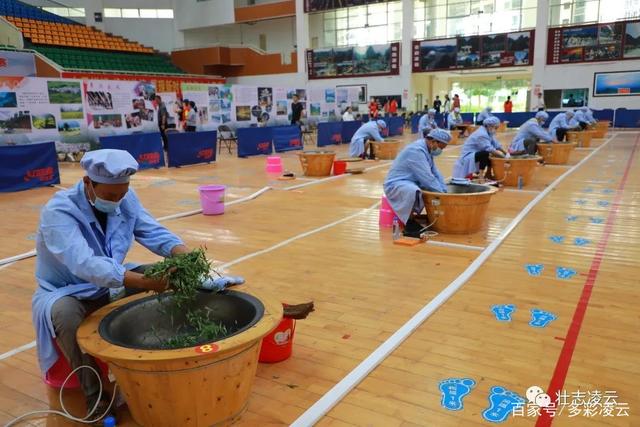 比赛由理论知识考试和实际操作比赛两部分组成。组委会为每位选手统一提供相同重量、相同品质的凌云白毫茶一芽一叶标准鲜叶。比赛现场,炒茶锅有序排列,制茶选手把鲜叶杀青、炒青、抖水、揉捻、翻炒、抖散......馆内空气中散发出浓浓的茶香;取器、提壶、翻杯、置茶、冲泡......茶艺师们娴熟的茶艺表演,让大家领略了雅致的茶文化。