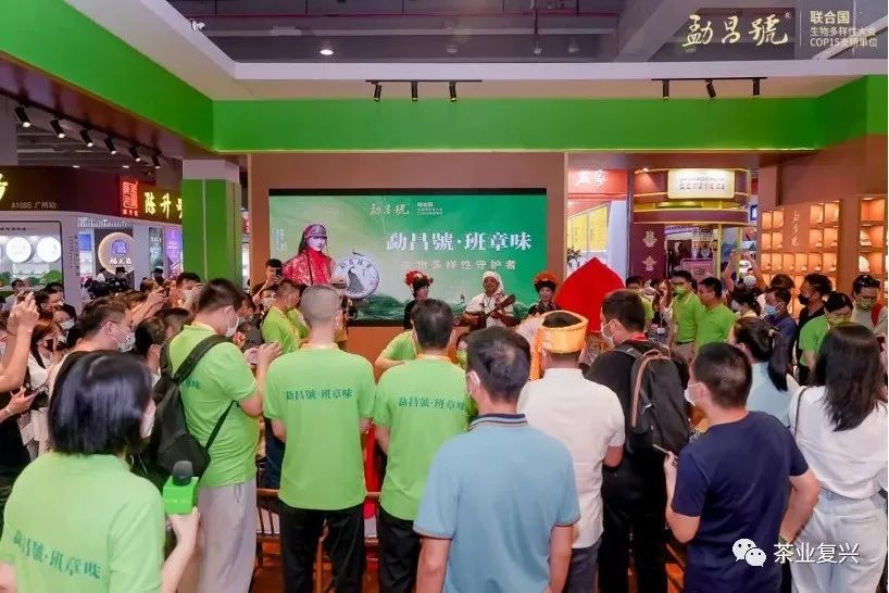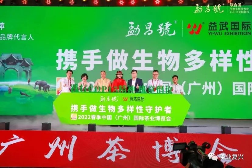 △云南勐昌茶业有限公司肖文德董事长(右一)、勐昌號品牌代言人杨丽萍(右六)出席广州茶博会开幕式典礼广东省是中国最大的普洱茶消费区,而广州茶博会更是有着“中国普洱茶第一展”之称。在本次茶博会开幕式上,勐昌號携手品牌代言人杨丽萍,与现场嘉宾共同开启“践行COP15精神 做生物多样性守护者”仪式。在这开放性的大舞台上,勐昌號携手杨丽萍向世界发起做生物多样性守护者,传递云南普洱茶、民族文化及生态理念,可以说具有发展性的时代意义。与此同时,勐昌號还在现场精心打造了首个班章生物多样性展区,把班章古茶园原生态之美以及云南特色的民族茶文化搬到了国际化的大都市,成为了本次茶博会最热闹的场馆之一,受到了广州市领导以及茶博会主办方领导的一致肯定。