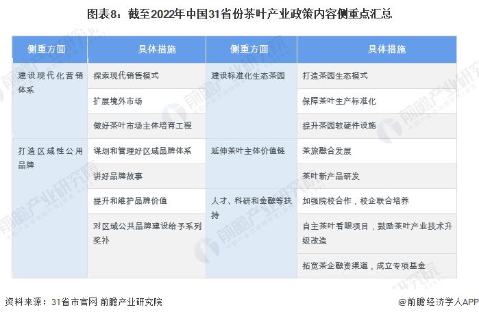 汇总省份茶叶产业政策,文章认为产业政策可归结为建设现代化营销体系、打造区域性公用品牌、建设标准化生态茶园、延伸茶叶主体价值链四大侧重点。
