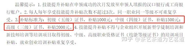 初级茶艺师证书补贴1000元,中级茶艺师证书补贴1500元,高级茶艺师证书补贴2000元。