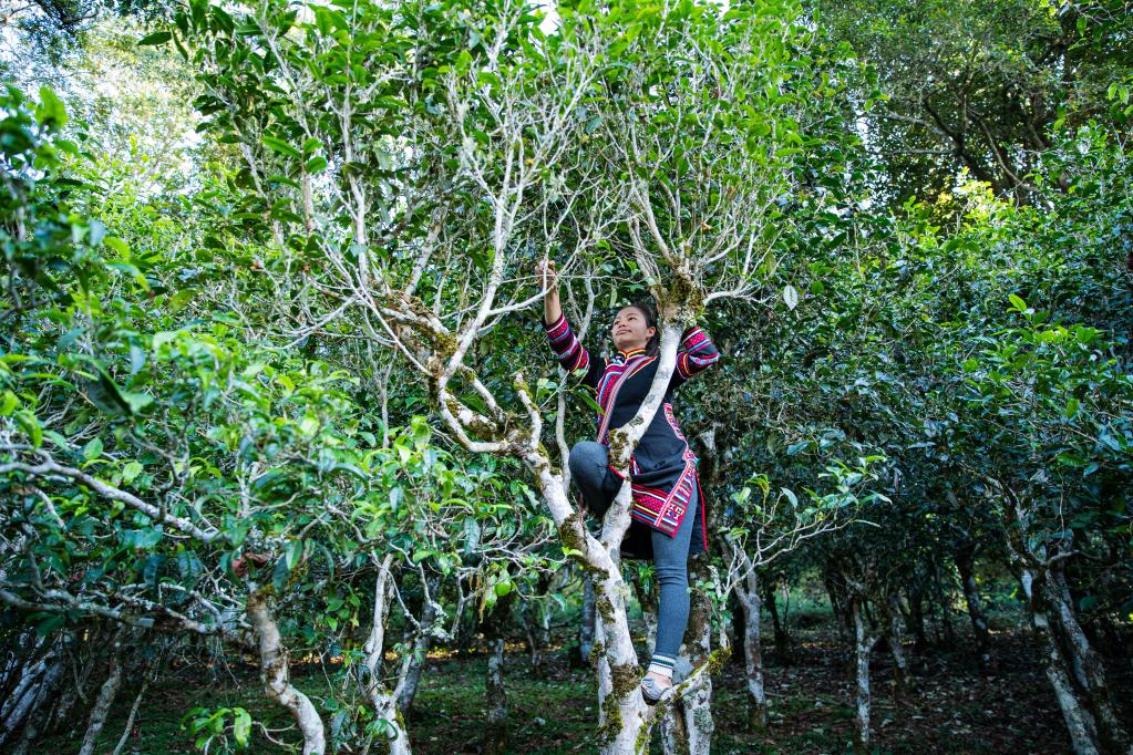 茶农罗远芳在古树茶上除枯枝。新华社记者 孙敏 摄