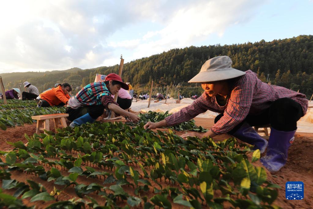11月28日,村民在贵州省锦屏县三江镇卦治村茶苗培育基地扦插茶苗。