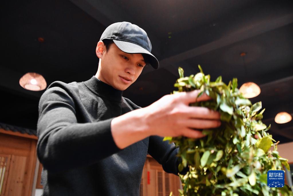 12月1日,国家级非物质文化遗产武夷岩茶(大红袍)制作技艺的唯一女性传承人游玉琼(右)在指导儿子方舟学习武夷岩茶(大红袍)制作技艺的“手工摇青”。新华社记者 魏培全 摄