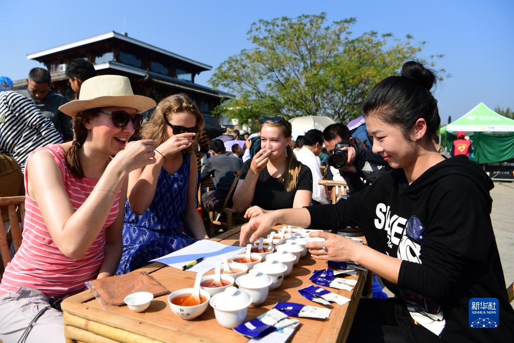 这是武夷传统茶俗“民间斗茶赛”现场,外国游客在品尝武夷岩茶(2017年10月28日摄)。新华社记者 魏培全 摄