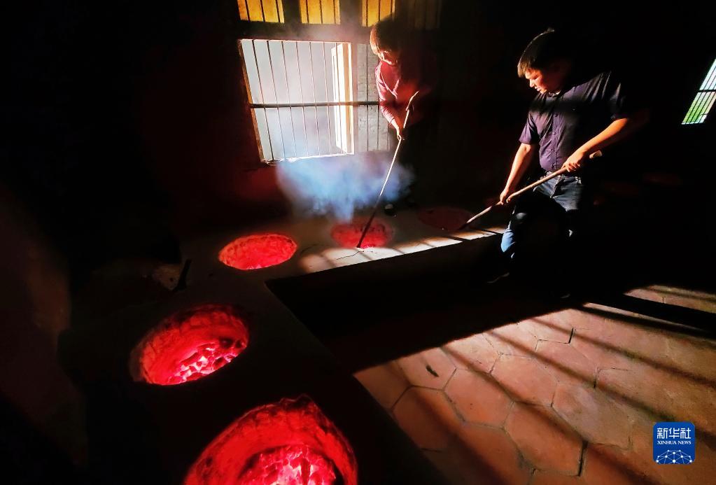 国家级非物质文化遗产武夷岩茶(大红袍)制作技艺的唯一女性传承人游玉琼(左)在指导儿子方舟学习武夷岩茶的木炭烘焙法(2020年5月10日摄)。新华社记者 魏培全 摄