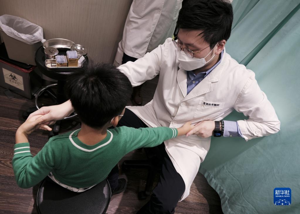 12月16日,在香港浸会大学北角中医专科诊所,中医师张振海(右)为一名小朋友推拿诊疗。新华社记者 王申 摄
