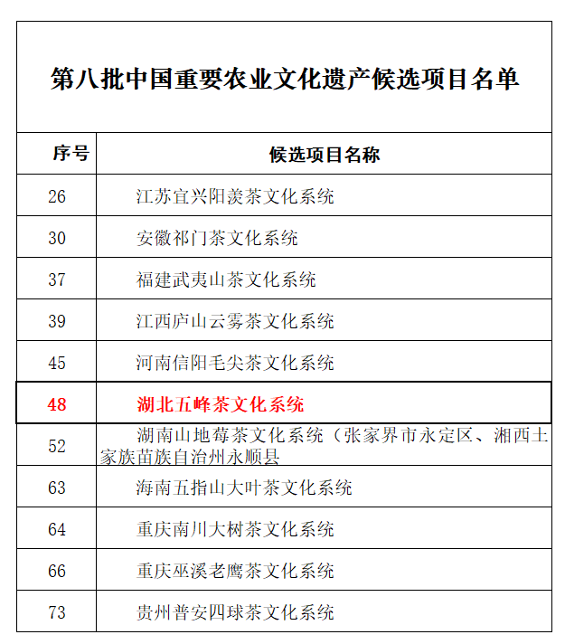 (湖北茶叶网消息)农业农村部2026年1月12日发布“第八批中国重要农业文化遗产候选项目名单公示”,全国各地共11项茶文化系统入选,其中“湖北五峰茶文化系统”成功入选,本次公示为期五天,自2026年1月12日至2026年1月16日。