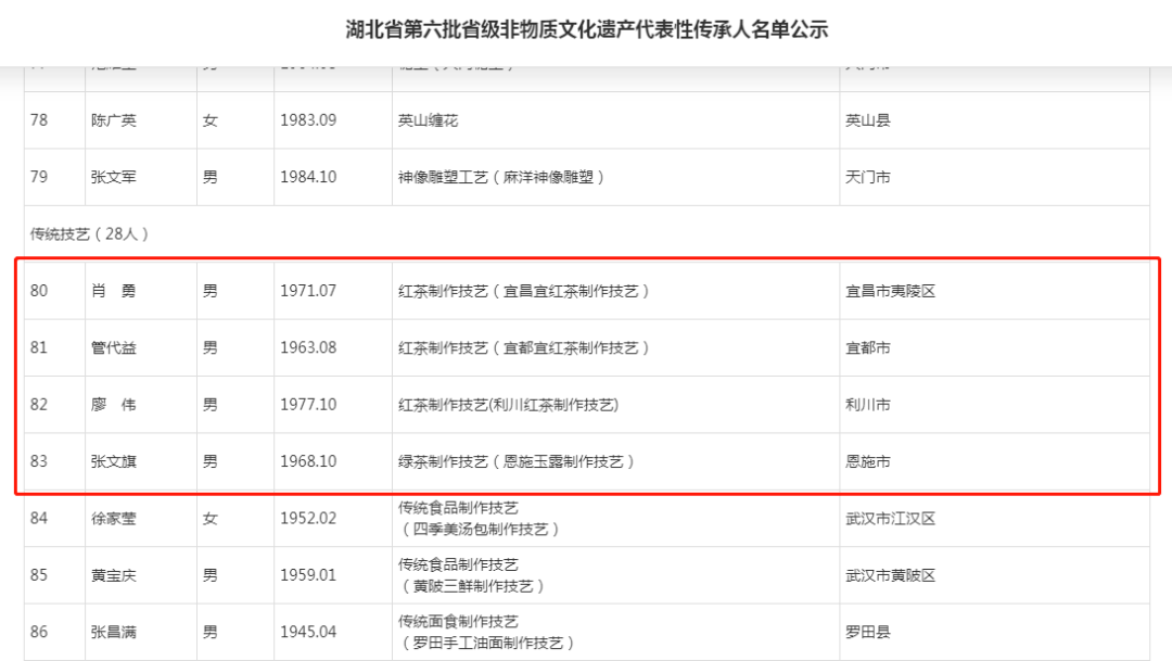 其中,在“传统技艺”非遗项目中湖北4名茶人入选,分别是红茶制作技艺(宜昌宜红茶)肖勇、管代益,红茶制作技艺(利川红)廖伟,绿茶制作技艺(恩施玉露)张文旗。