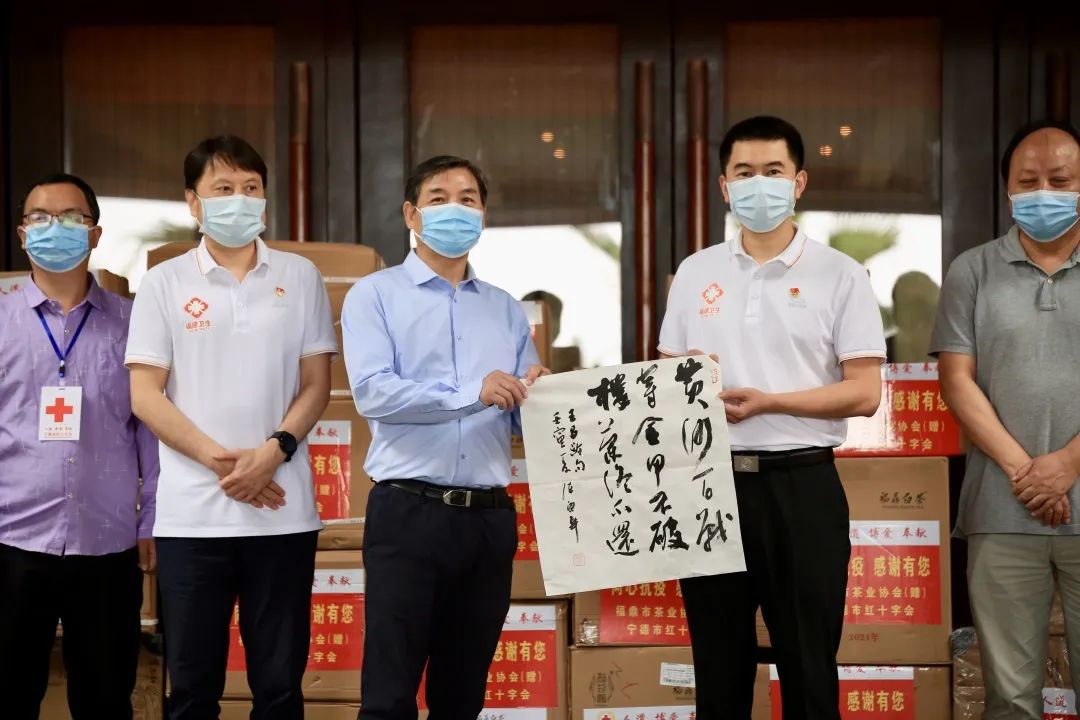 福建省美术家协会、福建省书法家协会、福鼎市茶业协会、福鼎市美术家协会分别派出代表向援沪医疗队赠送作品。