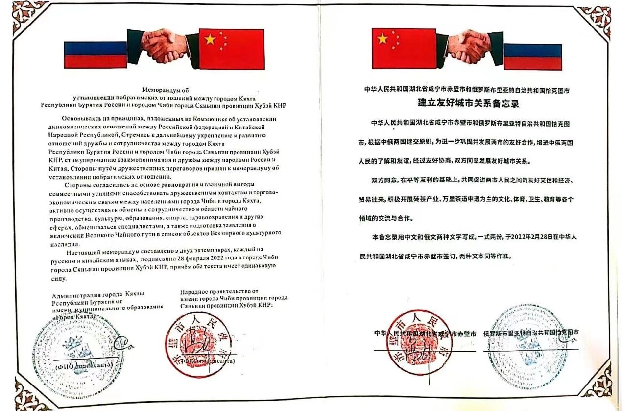 2022年2月赤壁市与恰克图市建立友好城市备忘录