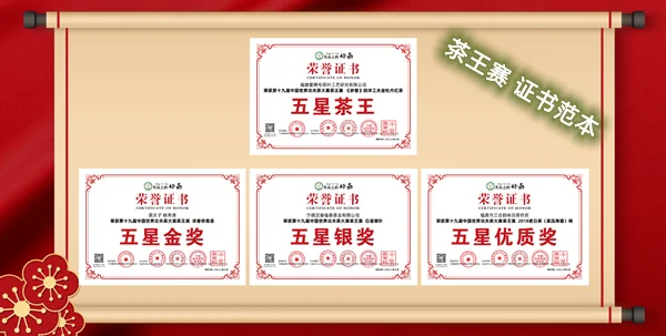 5)、每款茶品以60个茶样为基础,设置奖项为五星茶王1名、五星金奖2名、五星银奖5名、五星优质奖数名(组委会可根据实际情况调整奖项增减),获得者颁发大赛组委会荣誉证书;