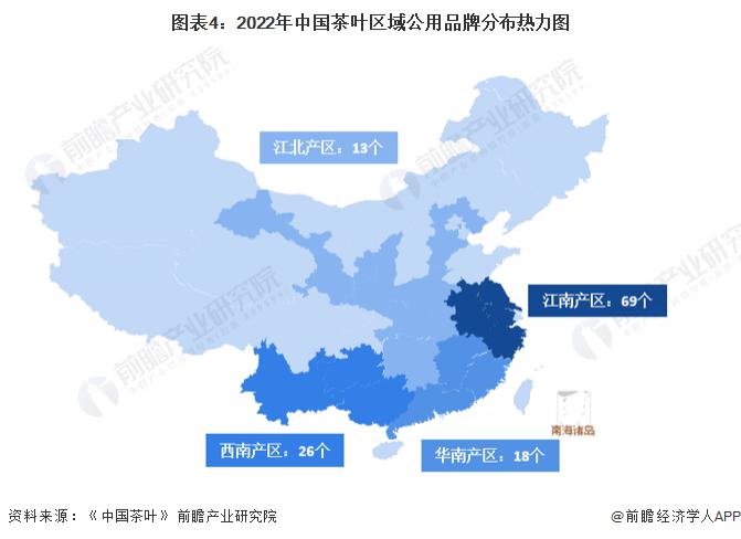 2022 年中国茶叶区域公有品牌分布于四大产茶区,其中江南产区分布最为密集,数量达到 69 个 ; 西南产区数量达到 26 个,位列第二 ; 华南、江北产区分列第三、四位,分别达到 18 个、13 个。