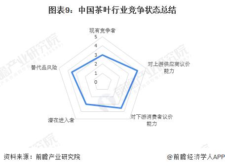 从五力竞争模型角度分析,目前,茶叶属于传统行业,受新兴替代品威胁较大 ; 现有竞争者数量多,竞争风险高 ; 现阶段茶叶市场供过于求,且行业上游一体化能力较强,故对上游供应商议价能力较强 ; 同时,因行业准入资质以及资金、技术门槛一般,但盈利前景也较弱,故行业吸引力一般,潜在进入者威胁较小。根据以上分析,对各方面的竞争情况进行量化,5 代表最大,0 代表最小,目前中国茶叶行业的五力竞争情况总结如下: