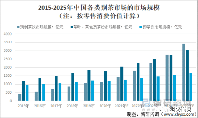 智研咨询数据显示,2022年“现制茶饮”和“茶叶、茶包、茶粉”的市场规模将分别达到1803.62亿元和2266.78亿元,到了2025年还将进一步上升至3402.84亿元和3022.05亿元。