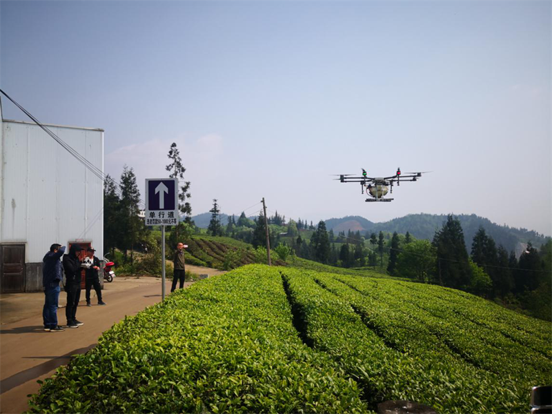 公安部协调社会力量捐赠给普安县的无人机正在为茶树喷洒农药,助力当地茶园统防统治、严控农残超标