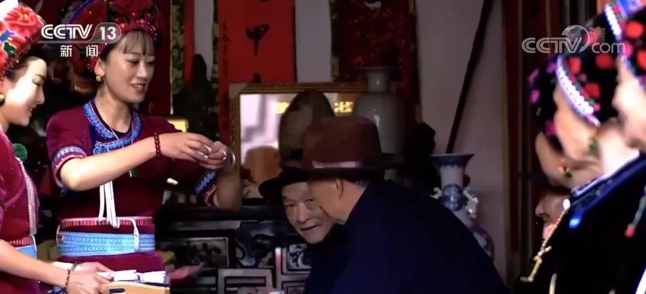 这位身着白族传统服饰,正在人群中敬茶的人叫董金香,是白族三道茶非遗项目州级代表性传承人。