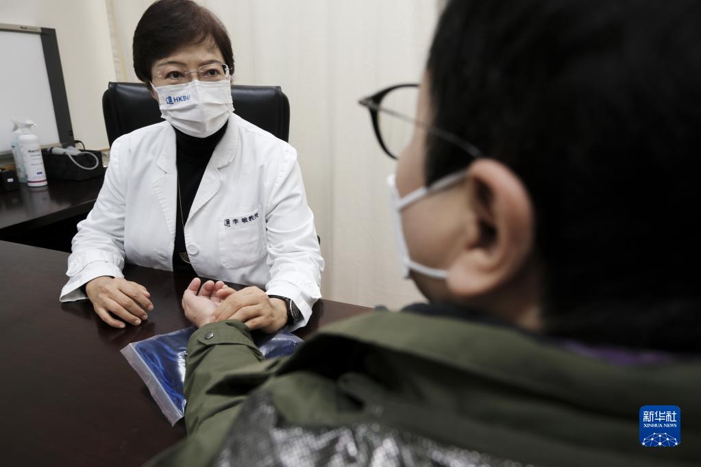 12月13日,在香港浸会大学陈汉贤伉俪中医专科诊所暨临床规范研究中心,中医药学院副院长李敏(左)在为病患把脉。新华社记者 王申 摄