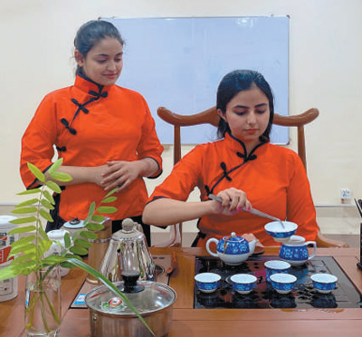 “这是历史悠久的中国品茶方式,茶汤清香四溢,品尝时先觉微苦后显甘甜。”身穿中式红色斜襟罩衫,巴基斯坦旁遮普大学孔子学院三年级学生谢海尔·贝诺在孔子学院开放日活动上,与同学们为来访的父母和朋友们奉上一杯中国茶,以中国式的礼仪表达了最热烈的欢迎。这是贝诺第一次向父母敬茶,她一边烫壶、泡茶、分杯,一边与父母分享品茶经验。中国自古就以礼仪之邦著称于世,中国茶注重礼仪和情谊,向父母敬茶意味着传承和回馈。“小时候在家里,总是母亲为我们煮茶。如今我很高兴自己能用另一种方式向母亲表达我的爱与感谢。”她说。