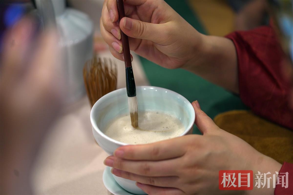 茶艺师运用“七汤点茶法”,点茶时分七次注水击拂,点好的茶汤上面会泛出一层乳白色的茶汤泡沫,泡沫持续时间越长、越“咬盏”,则在古代“斗茶”场景中就越为佳品。在此基础上,茶艺师还要用毛笔蘸取茶膏作画,有人说“这是最早的咖啡拉花”。