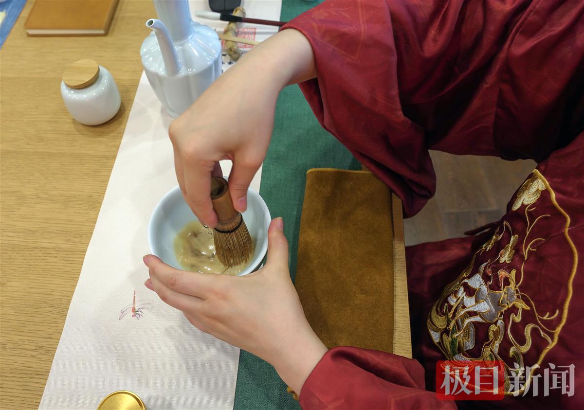 在茶艺师的指导下,提前报名的8名体验者也动手亲自体验了一番古人的“花式”点茶技艺。李锐介绍,点茶法盛行于宋代,但早在唐五代时期就已经出现了这种饮茶法。