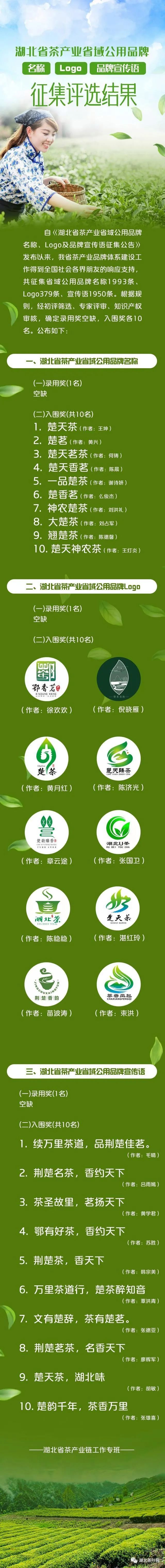 (湖北茶叶网消息)省茶产业链工作专班获悉,湖北茶省域公用品牌名称、Logo及品牌宣传语的征集结果揭晓,三大类别的录用奖空缺,共30个作品获入围奖,将各获2000元人民币奖励。8月18至9月17日,历时一个月的征集,累计收到邮件1991封,共汇总名称1993条,logo379条,宣传语1950条。省茶产业链工作专班进行预审,初步筛选入围名称867条,logo217条,宣传语972条;再通过组织专家评审会,最终形成获奖名单。征集规则要求“简单好记、内涵丰富、便于传播”,省域公用品牌名称要求不超过5个字,能体现湖北茶的文化底蕴和特色;Logo设计要结合楚文化和湖北茶文化精髓;品牌宣传语要与品牌名称相呼应。获入围奖的作品不乏优秀,但仍未达到专家评审会认可的理想效果,因此录用奖暂时空缺。本次征集由湖北省茶产业链工作专班主办,湖北省茶业集团股份有限公司承办,旨在加快推进湖北省茶产业品牌体系建设,推动湖北茶产业链高质量发展。“十四五”期间,湖北省茶产业结构持续转型升级,经济发展方式将向高质量转变,茶叶品牌建设迎来了重要的战略机遇期。湖北将以打造“省域公用品牌+区域公用品牌+企业品牌+产品品牌”体系为抓手,进一步提升湖北茶叶形象,提高品牌价值,促进茶农增收致富。据了解,湖北有81个中国茶叶地理标志品牌,其中绿茶49个、红茶11个、白茶1个、青茶1个、黄茶1个、黑茶2个,其他茶16个,是茶品类最为齐全的省份之一。目前,全省已形成鄂东大别山、鄂西武陵山、鄂西北秦巴山、鄂南幕阜山、鄂中大洪山等五大优势产区,拥有赤壁青砖茶、宜红工夫茶(含利川红)、恩施玉露、宜昌毛尖、武当山茶、英山云雾茶、襄阳高香茶等“五绿一红一黑”七大重点区域公用品牌。2022年,湖北茶园面积为558万亩,居全国第四;茶叶产量超过40万吨,居全国第二;16个县进入中国茶叶百强县。