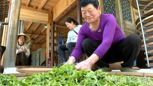 中午时分,茶庄里前来卖茶的村民络绎不绝。随后,槽门古寨寨主邓凯和制茶师傅一起将收来的春茶摊放在干净的白布上。刚采下的野茶,需要充足的阳光自然萎凋,让茶叶的水分逐渐消散。经过萎凋后的野茶还要经过揉捻、炭焙、静置等古法工艺才可以上市销售。
