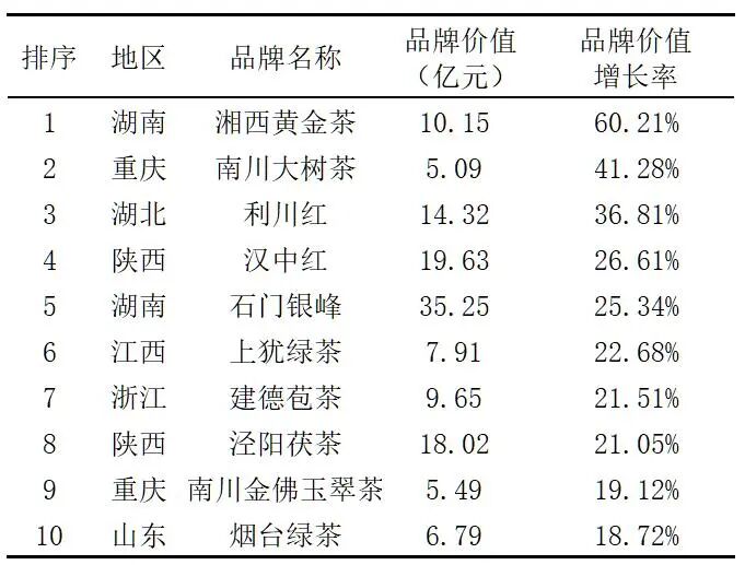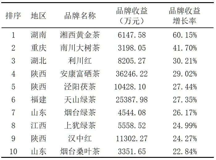 表8显示的是本次评估中品牌收益增长速度位于前10的品牌。数据表明,湘西黄金茶、南川大树茶、利川红等3个品牌的品牌收益增长率最高,分别达到了60.15%、41.70%和30.21%。安康富硒茶、泾阳茯茶、天山绿茶等7个品牌的品牌收益增长率也均在20%以上。