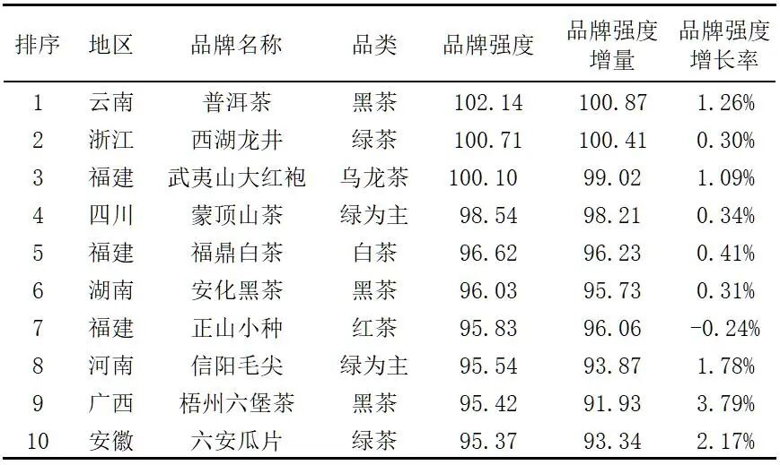 表 11 2025品牌强度位于前10的中国茶叶区域公用品牌