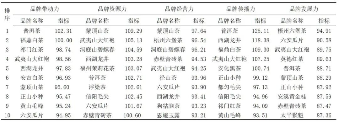 表12可见,本次获评品牌中“品牌强度五力”位于前10的品牌分别为:普洱茶分别以102.31、125.11位列品牌带动力、品牌传播力的首位,蒙顶山茶以109.29、97.64 获得品牌资源力、品牌经营力的首位,梧州六堡茶以94.91位列品牌发展力首位。武夷山大红袍的“品牌强度五力”均在前10位,西湖龙井、普洱茶、六安瓜片、蒙顶山茶等 4个品牌分别占 4 席,赤壁青砖茶和正山小种2个品牌各占3席,福鼎白茶、祁门红茶、黄山毛峰、洞庭山碧螺春、信阳毛尖和梧州六堡茶6个品牌各占2席,另有安吉白茶、福州茉莉花茶、浮梁茶、径山茶、狗牯脑茶、恩施玉露、安化黑茶、都匀毛尖、英德红茶、安溪黄金桂、太平猴魁等11个品牌各占1席。