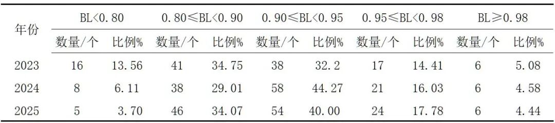 据评估数据,本次获评的茶叶区域公用品牌的品牌忠诚度因子平均值为0.905,较2024年的平均值(0.904)略有上升,较2023年平均值(0.885)具有显著性的上升,可见茶叶区域公用品牌的市场零售价稳定性在逐年增强。比较近三年获评品牌的品牌忠诚度因子区间分布(表10),数据显示,2025年评估中,品牌忠诚度因子高于0.95的获评品牌共计30个,占整体获评品牌比为22.22%,品牌数量与比例均高于2023年(23个,占比19.49%)和2024年(27个,占比20.61%);品牌忠诚度因子在0.80以下的品牌数量为5个,占获评品牌总量的3.70%,均较2023年、2024年有显著下降。