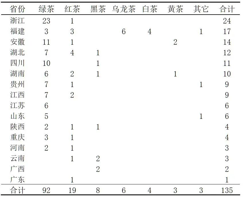 参与本次评估的中国茶叶区域公用品牌总数为143个,经课题组审核并获得有效评估的品牌共计135个,较上一年度增加了4个。课题组依据“中国农产品区域公用品牌价值评估模型”(简称 CARD 模型),采用科学、系统、量化的方法,经过对品牌持有单位调查、消费者评价调查、专家意见咨询、海量数据采集与分析,最终获得本文的相关数据。获得本次有效评估的135个中国茶叶区域公用品牌,其品牌注册、地理标志登记的地域范围覆盖全国四大茶区16个省(自治区、直辖市)。浙江、福建、安徽、湖北、四川和湖南等6省的品牌数量均在10个以上,其中浙江共计24个品牌获评。按照茶类进行比较分析,获评的135个品牌中,绿茶或以绿茶为主的品牌有92个(占本次获评品牌数量的68.15%),红茶19个,黑茶8个,乌龙茶6个,白茶4个,黄茶3个,花茶、苦丁茶、桑叶茶等其它茶类品牌共有3个。