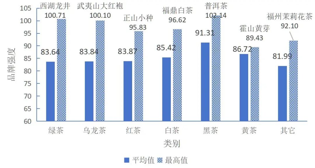 根据茶类比较,不同茶类的茶叶区域公用品牌的品牌强度平均值与最高值。如图7所示,本次评估中,绿茶类、乌龙茶类、红茶类、白茶类、黑茶类、黄茶类、花茶等其它类的中国茶叶区域公用品牌的“品牌强度”最高值获得者分别是西湖龙井、武夷山大红袍、正山小种、福鼎白茶、普洱茶、霍山黄芽、福州茉莉花茶。数据显示,绿茶类品牌的平均品牌强度为83.64,与获得最高值的西湖龙井(100.71)相比,差值高达17.07;乌龙茶类品牌的平均品牌强度为83.84,与最高值的武夷山大红袍(100.10),差值达到16.26;黑茶类品牌的平均品牌强度为91.31,这是本次评估中唯一一个“品牌强度五力”平均值超90的茶类,但其平均值与最高值的普洱茶(102.14)相比,差值仍然有10.83;黄茶类品牌的平均品牌强度为86.72,与最高值霍山黄芽(89.43)之间的差值仅2.72。数据表明,绿茶类、乌龙茶类品牌在品牌强度上存在较为明显的两极分化现象,黑茶类品牌总体上品牌强度表现较强。