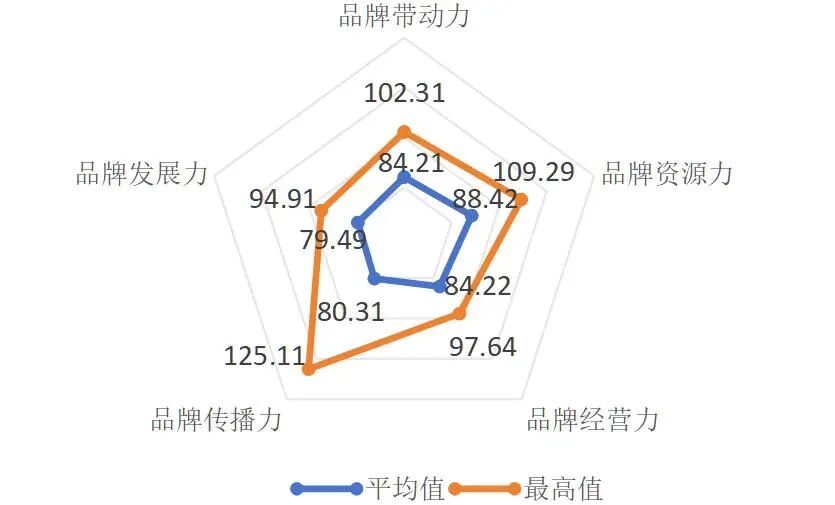 由图8可见,本次获评品牌的“品牌强度五力”中,品牌带动力、品牌资源力、品牌经营力、品牌传播力和品牌发展力的平均值依次为 84.21、88.42、84.22、80.31和79.49,“品牌强度五力”的最高值分别为 102.31、109.29、97.64、125.11 和94.91。