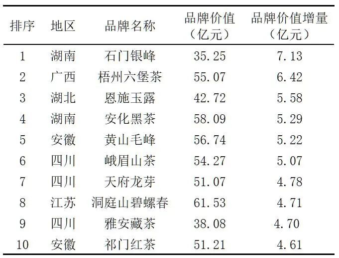 表 3 2025品牌价值增量位于前10的中国茶叶区域公用品牌