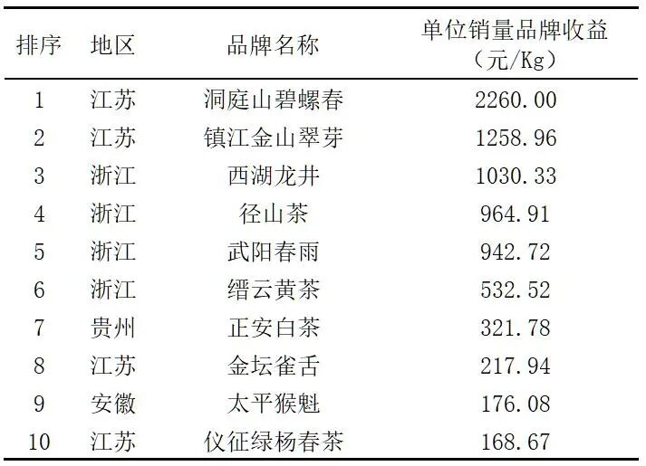 表9显示了获得本次评估品牌的单位销量品牌收益前10位品牌。数据可见,洞庭山碧螺春、镇江金山翠芽和西湖龙井分别以2260.00元/Kg、1258.96元/Kg、1030.33元/Kg位列前三。洞庭山碧螺春的单位销量品牌收益持续保持在2000元以上,品牌溢价能力遥遥领先。表9同时可见,浙江、江苏均有4个品牌的单位销量品牌收益位列前茅,贵州和安徽各占1个。