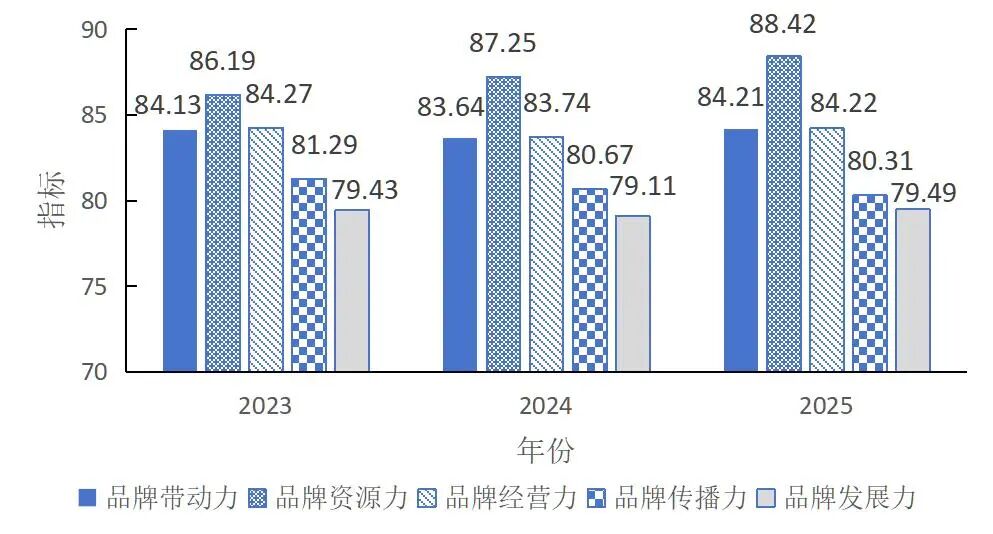 比较近3年获评茶叶区域公用品牌的平均“品牌强度五力”表现,如图6所示,总体上,品牌资源力呈持续上升的趋势,从2023年的86.19到2024年的87.25到2025年的88.42,逐年递升;品牌传播力则呈现持续下降趋势,从2023年的81.29到2024年的80.67再到2025年的80.31,逐年递减;品牌带动力、品牌经营力和品牌发展力均呈现小幅波动,总体基本持平。