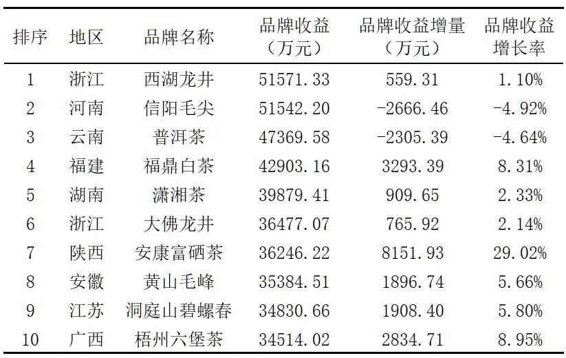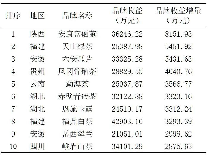 表7是获得本次有效评估品牌的品牌收益增量位于前10的中国茶叶区域公用品牌,安康富硒茶、天山绿茶和六安瓜片等3个品牌的品牌收益均较上年度增加了5000万元以上,凤冈锌硒茶、勐海茶和赤壁青砖茶等7个品牌的品牌收益均增加了2800万元以上。