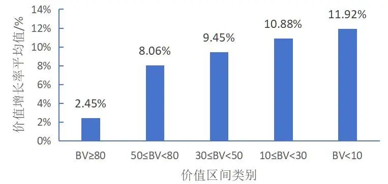 图 1 不同品牌价值区间品牌的品牌价值增长率的平均值比较