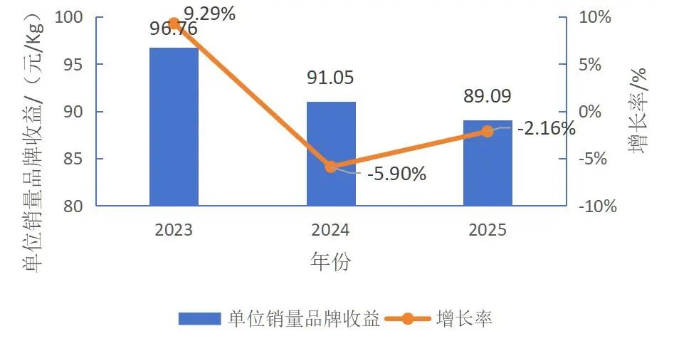 单位销量品牌收益,是品牌对每千克茶叶的溢价能力的直观体现。本次获评的135个茶叶区域公用品牌,其单位销量品牌收益的平均值为89.09元/Kg,较2024年获评品牌的平均值(91.05元/Kg)下降了2.16%;较2023年获评品牌的平均值低了7.68元/Kg(具体数据见图3)。数据显示,近三年,我国茶叶区域公用品牌在单位销量品牌收益上存在逐年下降的情况,2025年,下降速度有所减缓。