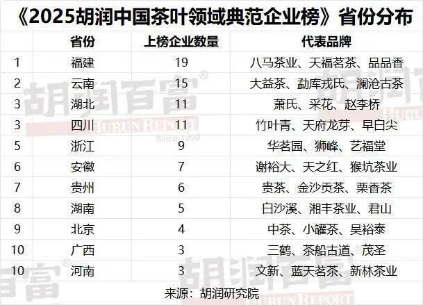 《2025胡润中国茶叶领域典范企业榜》同期发布。从省份分布来看,湖北上榜企业数量11家,位列全国前三,代表品牌包括萧氏、采花、赵李桥等。