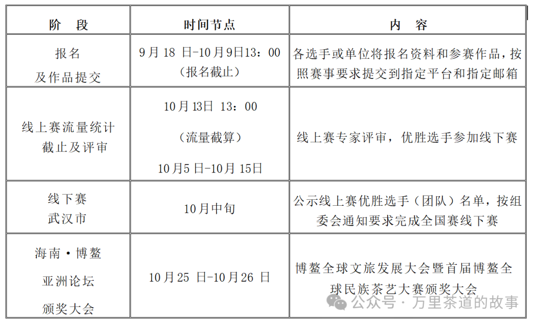 赛项流程 “万里茶道 · 民族茶艺 ·文创无限 ” 二、组织单位 主办单位: 中国国际文化传播中心 中国民族贸易促进会 世界旅游文化总会 IFBA 国际食品与饮料联盟 ABHA 亚太酒店联盟 中国民族贸易促进会文化与旅游工作委员会 博鳌全球民族文旅产业发展大会组委会 博鳌全球民族茶艺大赛组委会 承办单位: 湖北省酒店管理职业教育集团 武汉万里茶道的故事文化发展有限公司 协办单位: 湖北汉口茶厂有限公司 湖北中新文旅发展有限公司 武汉玖歌文旅科技有限公司 湖北茶全书文化发展有限公司 支持单位: 武汉茶叶协会 武汉茶艺馆行业协会 武汉炎黄文化研究会 湖北省茶业集团股份有限公司 湖北陆羽茶文化研究会 参赛对象 1.个人/团队:年龄在18周岁及以上的茶艺从业者、茶艺爱好者以及大中专的学生,团队参赛人数上限为5人。 2.单位/机构:具备茶文化推广、茶艺培训或文旅活动承办经验的企事业单位、社会组织等,可作为单位/机构参赛,并需指定1-2名代表负责对接赛 二.报名材料 1.个人/团队需提交身份证明、茶艺经历说明(200字以内)、参赛作品初步方案(含文化背景说明); 2.单位/机构需额外提交营业执照或社会组织登记证书复印件、相关资质证明(如茶文化推广案例、茶艺培训资质等)、参赛团队成员名单及身份证明。 三、赛道设置 (一)茶与艺术赛道 1.核心要求 围绕“万里茶道 · 民族茶艺 ”的赛事主题,以“茶 ”为灵感,通过静态作品设计、动态作品设计展现“茶 ·艺 ”美学与应用。 2.提交内容      静态作品: (1)所有图片类作品以电子图片形式提交,手绘、计算机绘图均可,图片 为 JPG 格式,计算机绘图要求 RGB 色彩模式、分辨率 300dpi;图片内容应包括 完整的作品设计,保证图片的清晰度和文字的可 辨识度。 (2)作者需保留CMYK格式,300dpi 的可用于媒体传播,设计印刷生产的位图 源文件或矢量文件(最终 需提供AI、PSD等式)     动态作品(视频): 平面动态、拍摄动态、3D 动态等不限。 尺寸:不限,gif 格式文件不大于 10mb ,mp4 格式文件不大于200m。 (二)茶与传播赛道 1.核心要求 以“万里茶道 · 民族茶艺 ”为主题,通过新媒体传播(短视频、直播脚本、 社交媒体策划等),打造年轻化、国际化的茶文化传播内容,激活“文化基因- 场景体验-消费转化 ”链条。 2.提交内容 (1)传播视频(3 分钟内,MP4 格式,可含多语种字幕,体现传播力与创意性); (2)传播方案(300 字以内,含目标受众分析、传播策略及预期效果)。 四、比赛安排 五、作品提交要求 1.材料完整性:需提交作品电子版(视频+说明文档)及《参赛登记表》(见 附件)。 2.格式规范:视频:MP4 格式,清晰度不低于 1080P,“茶与艺术 ”赛道文 件≤200MB,“茶与传播 ”赛道文件≤300MB;文档:Word 格式,A4 排版,标题 黑体三号,正文宋体小四。 3.视频提交:参赛作品中的视频内容,参赛者应以个人名义(可创建新账号) 自报名之日起, 加入大赛官方提供的视频水印(赛事视频水印文件详见官方账号信息),发布于小红书和抖音平台,并@大赛官方账号(各平台账号名称见官方账号公布)。参赛视频在公域平台的流量统计截止时间为 10 月 6 日 12:00。选手应在此时间点打开视频后台,截取流量总览图,并将该截图发送至官方指定的联系账号。该数 据将作为评估参赛作品在大众传播方面得分的重要依据。 4.提交邮箱:3677341282@qq.com(截止时间:10月 9 日 13:00,逾期不予受理)。 六、参赛注意事项 1.政治与法律合规:  不得反对国家基本原则、危害国家安全、泄露国家秘密、 破坏国家统一、损害国家荣誉和利益、煽动民族仇恨、破坏民族团结、宣扬邪教 迷信、扰乱社会秩序等。 严格遵守中华人民共和国法律法规,作品内容积极健 康向上。 2.社会公序良俗:  不得含有色情、暴力、血腥、赌博、恐怖等不良内容,不 得破坏社会稳定性,不得违背传统道德观念、损害青少年身心健康。 作品内容 需符合社会公德和民族优秀文化传统。 3.知识产权与原创性:  严禁剽窃、抄袭,参赛作品必须由参赛者本人原创, 保证拥有作品的完全著作权,并确保不侵犯任何第三方的著作权、肖像权、名誉 权、隐私权等合法权益。 如涉及他人肖像或作品,需事先取得授权。主办方对 因作品侵权产生的纠纷不承担责任。 4. 版权声明:参赛作品之著作权归属作者与大赛组委会及承办单位共同所有,其学术交流及文化旅游推广之使用权由各方共享(作者保留署名权)。 七、联系方式 联系人:贺先生         电话:13307126156 联系人:胡先生         电话:17354346034 赛事组委会指定赛事邮箱:3677341282@qq.com 赛事组委会指定微信号:boaoGETeaArtC   赛事组委会指定小红书账号:boaoGETeaArtC 赛事组委会指定抖音账号:boao.GETeaArtC 附件:《博鳌全球民族茶艺大赛参赛登记表》、《校区赛事汇总表》(可联系上述邮箱获取) 赛事规程最终解释权归赛事组委会所有