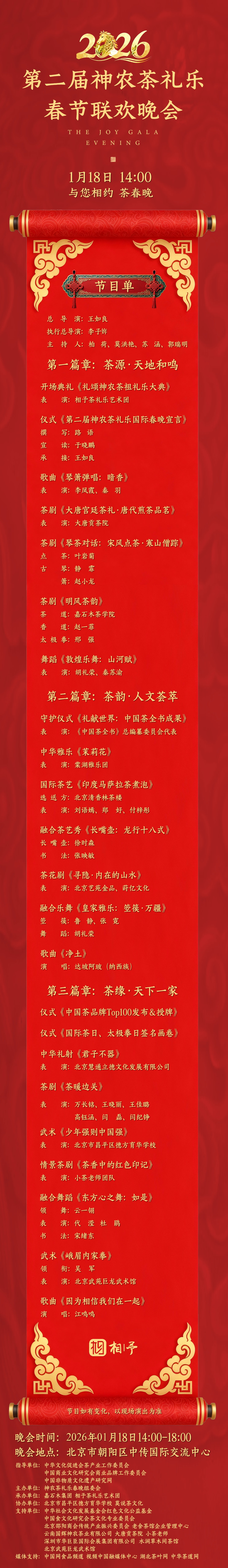 (湖北茶叶网消息)2026茶界春晚——第二届神农茶礼乐春节联欢晚会,将于1月18日在北京举办。本次活动由中华文化促进会茶产业工作委员会、中国商业文化研究会商业品牌工作委员会、中国非物质文化遗产研究网等多家单位共同指导,神农茶礼乐春晚组委会主办,嘉石木集团、相予茶礼乐艺术团等多家单位共同承办。从神农尝百草到“一带一路”,从茶马古道到人类命运共同体,一片茶叶,承载着中华民族“与天不老、与国无疆”的精神密码,更寄托着世界人民 “和衷共济、和合共生”的美好愿景。神农茶礼乐春晚不是一台简单的综艺晚会,而是一场“文明保卫战”“价值宣言书”“时代冲锋号”。中华民族既能创造光耀古今的文明成果,也必将在新时代新征程上,以茶为媒、以礼为序、以乐为和,为全球文明对话提供东方范本,为构建人类命运共同体注入源源不断的文化动能!