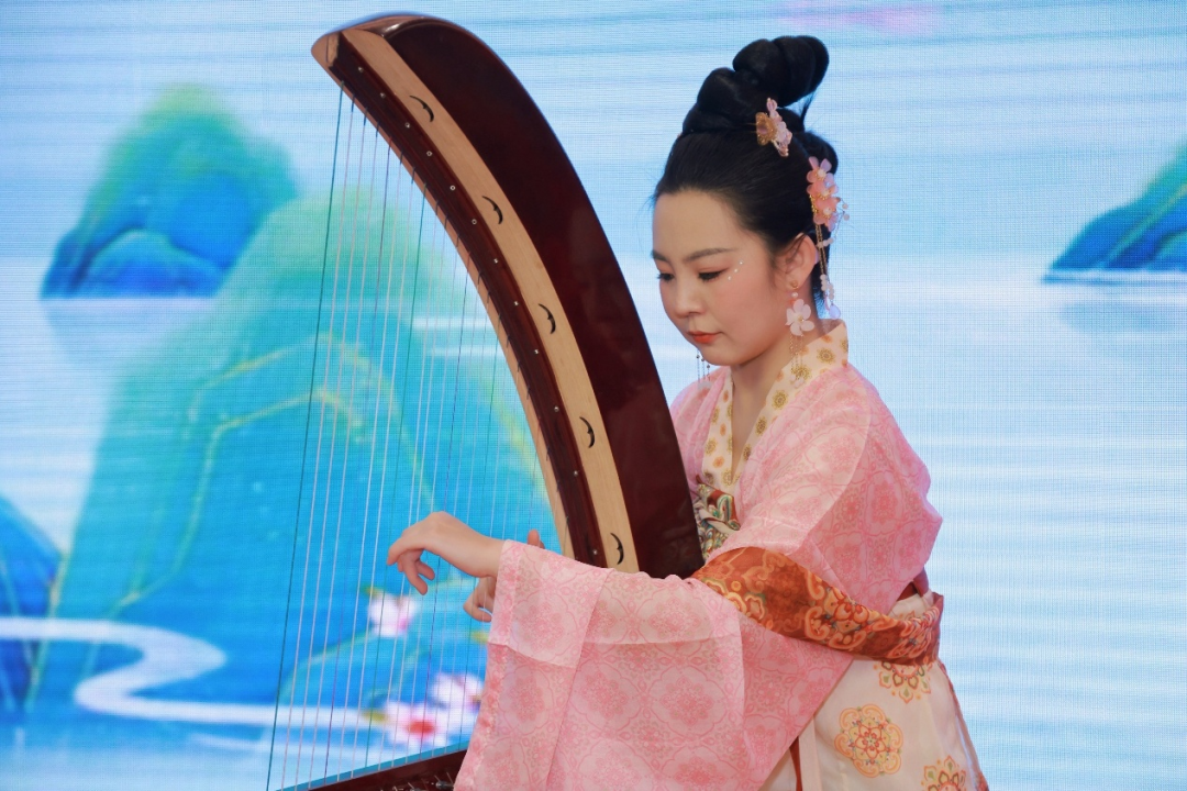 融合乐舞《皇家雅乐:箜篌·万疆》表演者:胡礼荣(左)鲁静(中)张霓(右)