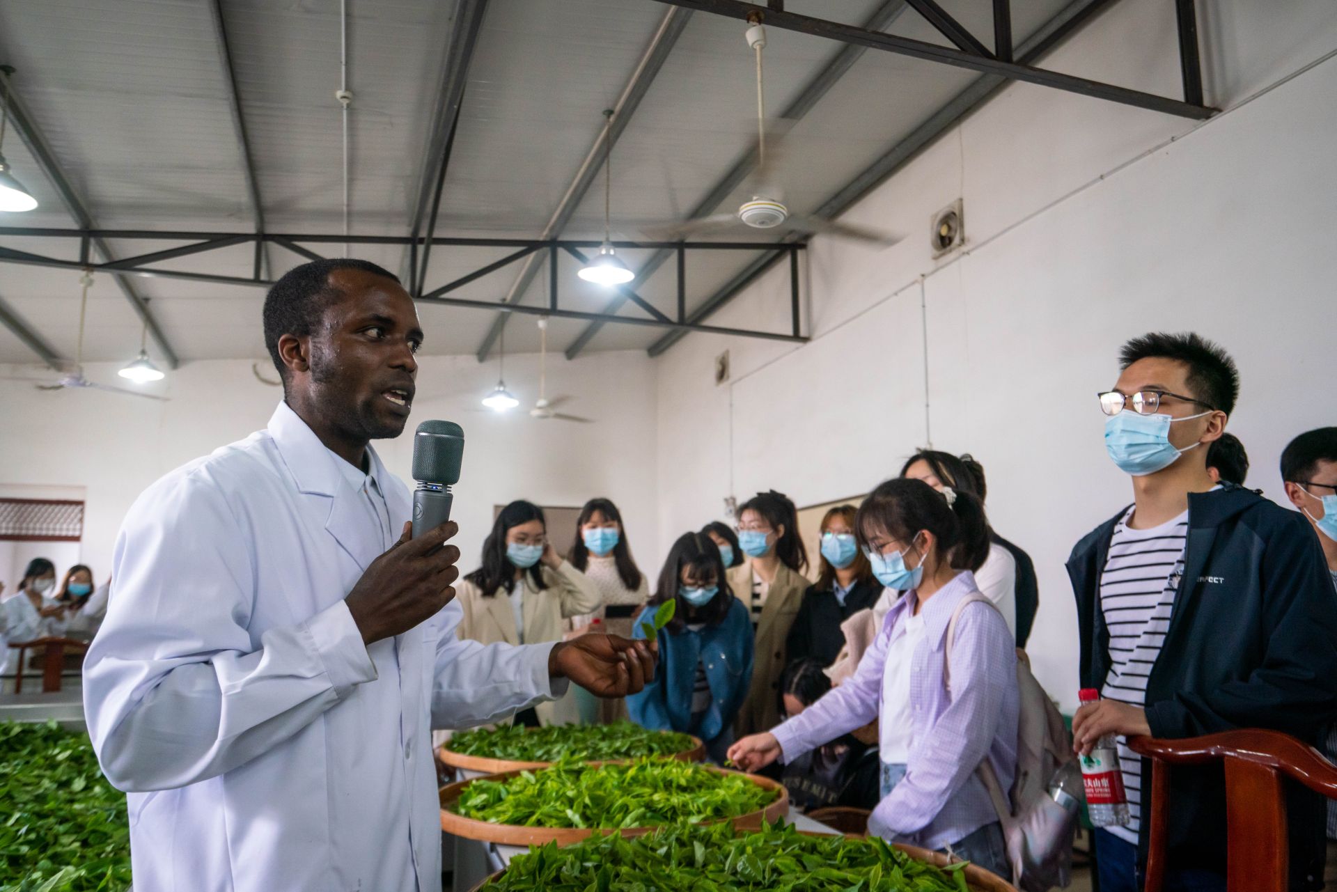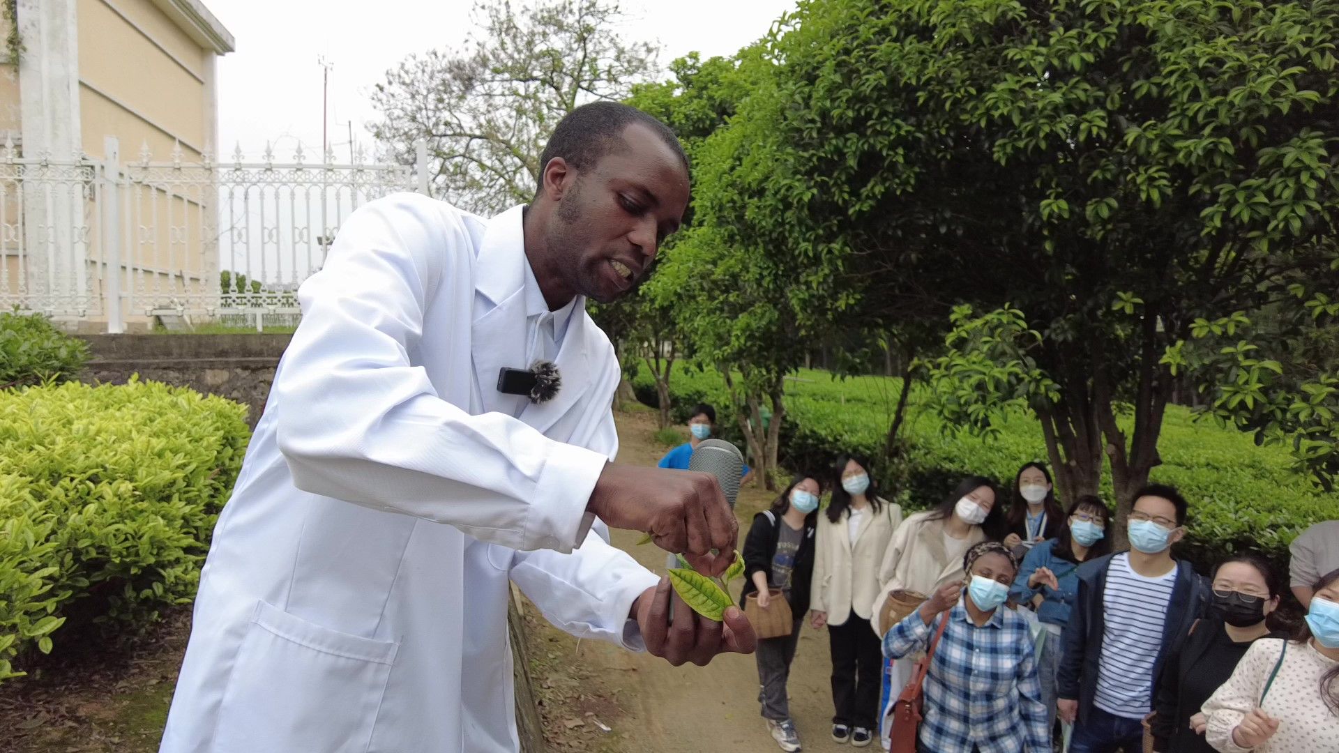 “采茶叶时不宜用指甲直接掐断,而应掰采或提采,一根茶尖加上两根茶叶最合适。”本次活动的讲解员,来自卢旺达的留学生马楠博士摘下一截茶叶,讲解着采茶的要领。