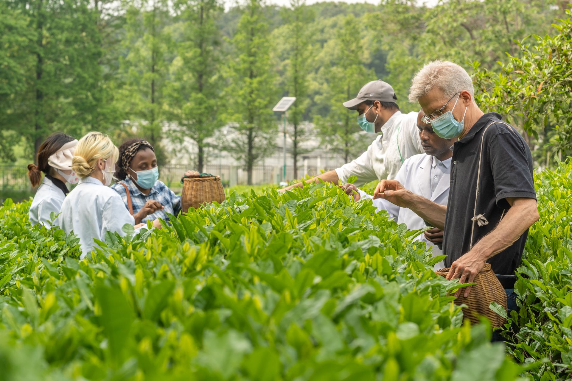 茶学1901班的同学们与外国友人在茶园中一起采摘茶叶