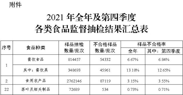 与上年比,茶叶及相关制品、蜂产品等21大类食品抽检不合格率有所降低,但餐饮食品、食用农产品等10大类食品抽检不合格率有所上升。茶叶及相关制品样品抽检数量/批次为72689,不合格样品数量/批次为534,全年样品不合格率为0.73%,其中第四季度样品不合格率为0.71%。