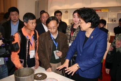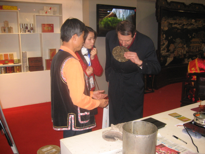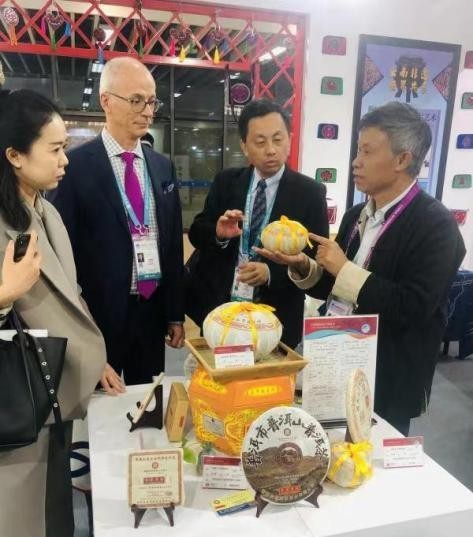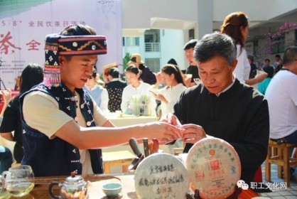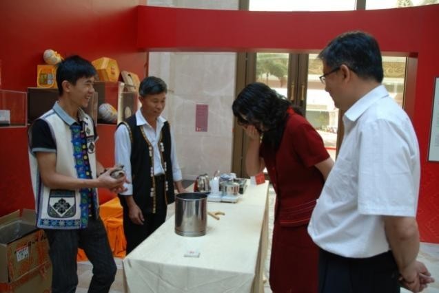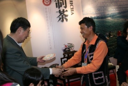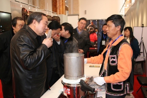 茶类项目展出有福建乌龙茶和普洱贡茶两家,在宁洱普洱茶•贡茶制作技艺展厅,李兴昌与家人和徒弟一起现场为观众展示了大山深处的青枝绿叶是如何演变成被皇室贵族视为金枝玉叶的神秘过程,并辅以普洱茶科学冲泡,保健功能,科学收藏方法的讲解,吸引了大批中外观众。