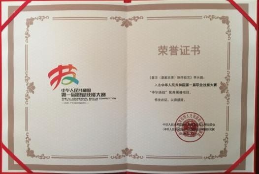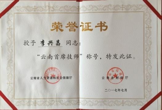 云南首席技师荣誉证书 入选中华绝技荣誉证书
