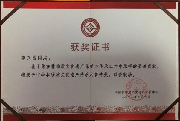 李兴昌还荣获上述各地举办单位的“成绩突出奖”,“突出贡献奖”,“最受观众喜爱的传承人”,“最佳创意奖”,“全国优秀传承人、薪传奖”,“中国当代杰出非物质文化传承人2019年度人物奖”,“薪火相传奖”“最佳组织奖”,入选中华人民共和国职业技能大赛“中华绝技”优秀展播项目等奖项。先后被认定为:国家级非物质文化遗产,省级代表性传承人,云南首席技师,普洱大国茶匠,普洱茶专家委员会专家委员,以及其他诸多荣誉称号及头衔职务。诸如:国家级非物质文化遗产优秀传承人;中华非物质文化遗产发展基金会普洱茶制作首席顾问;中国国际经济发展研究中心授予茶行业最具影响力十大领军人物,特聘为茶叶行业(协会)副理事长;湖北省收藏家协会茶文化研究会特聘为普洱茶技术顾问;云南省茶马古道保护开发促进会理事;普洱茶叶协会副会长;普洱困鹿山皇家贡茶文化研究会副会长;普洱古府文化研究会副会长;滇西应用技术大学普洱茶学院客座教授,导师;普洱学院客座教授;应邀入住普洱市公共创业实训基地建立大师工作室。“贡技”商标被云南省人民政府认定为:“云南省著名商标”。李兴昌家的“贡技茶场”,被国家文化部(今国家文旅部)列为第一批国家级非物质文化遗产生产性保护示范基地。皇家贡技“三餐茶”,被上海健康协会在2018年11月第一届中国国际进口博览会隆重推出。