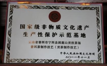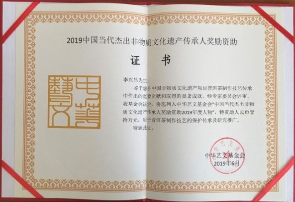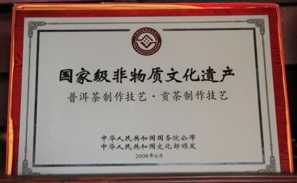 2008年6月,由思茅市文化局(今普洱市文旅局)高飞燕,李忠伟,杨文康,苏云主持整理的,以李兴昌家族传承的普洱茶制作技艺,作为主要申报材料的普洱茶•贡茶制作技艺的文案,照片,视频组成的申报资料,经各级文化主管部门逐级申报,荣获中华人民共和国国务院、中华人民共和国文化部批准,列入国家级非物质文化遗产保护名录。获此殊荣,与各级党政领导以及主管部门积极争取密不可分。同时与一心一意坚持把普洱贡茶制作技艺传承,发扬光大,而一直默默努力坚守的李永安先生、匡志英女士夫妇息息相关。